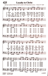 The Bible way to Heaven - 1 From over hill and plain There comes the signal strain, 'Tis loyalty, loyalty, loyalty to Christ; Its music rolls along, The hills take up the song, Of loyalty, loyalty, Yes, loyalty to Christ. Chorus: "On to victory! On to victory!" Cries our great Commander "On!" We'll move at His command, We'll soon possess the land, Thro' loyalty, loyalty, Yes, loyalty to Christ. 2 O hear, ye brave, the sound That moves the earth around, 'Tis loyalty, loyalty, loyalty to Christ; Arise to dare and do, Ring out the watchword true, Of loyalty, loyalty, Yes, loyalty to Christ. (Chorus) 3 Come, join our loyal throng, We'll rout the giant wrong, 'Tis loyalty, loyalty, loyalty to Christ; Where Satan's banners float We'll send the bugle note, Of loyalty, loyalty, Yes, loyalty to Christ. (Chorus) 4 The strength of youth we lay At Jesus' feet today, 'Tis loyalty, loyalty, loyalty to Christ; His Gospel we'll proclaim, Throughout the world's domain, Of loyalty, loyalty, Yes, loyalty to Christ. (Chorus) - -